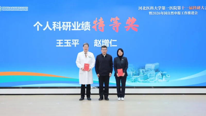 近日,河北医科大学第一医院第十一届科研大会暨2026年“国自然”申报工作推进会召开。河北省卫生健康委一级巡视员段云波、河北医科大学党委书记于树江、河北省科技厅科技安全与民生任务处三级调研员张小林出席会议。会议由河北医科大学第一医院党委副书记、院长乔治斌主持。