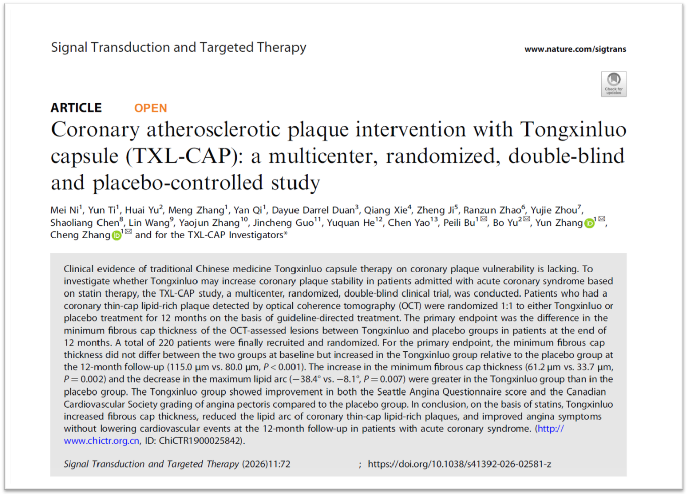 “通心络胶囊干预急性冠状动脉综合征冠状动脉粥样硬化斑块的随机、双盲、安慰剂平行对照、多中心临床研究”是国家重点研发计划项目“脉络学说营卫理论指导系统干预心血管事件链”的子课题,由山东大学齐鲁医院张澄(欧洲科学院院士)、张运院士、卜培莉和哈尔滨医科大学附属第二医院于波团队牵头,全国17家三级甲等医院共同完成,聚焦“现代标准西药治疗基础上,通心络能否进一步稳定冠状动脉易损斑块”。