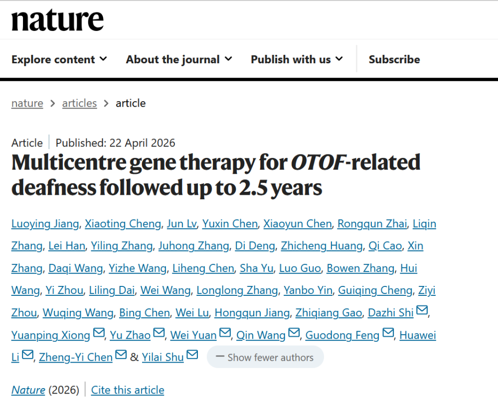 近日,国际知名学术期刊《自然》在线发表了复旦大学附属眼耳鼻喉科医院舒易来教授领衔开展的耳畸蛋白(OTOF)基因治疗多中心临床研究的相关成果。南华大学附属第二医院作为参与该研究的8家核心单位之一,高质量完成了受试者招募、临床干预、规范随访与数据采集,为研究的安全性、有效性验证提供了关键支撑。