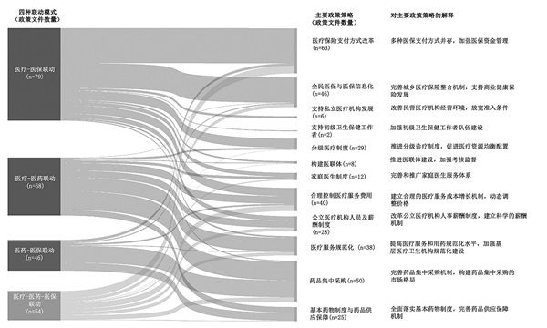“三医”联动改革政策涉及医疗和医保的政策文件数量最多。这些措施主要分布在“医疗保险支付方式改革”“全民医疗保险与医疗保险信息化”和“分级诊疗”等主要策略中。但只有少数政策措施在医疗、医保和医药之间实现了全面协调。