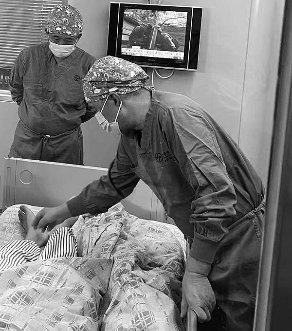 刘启发(右)为重症患者做全身检查。