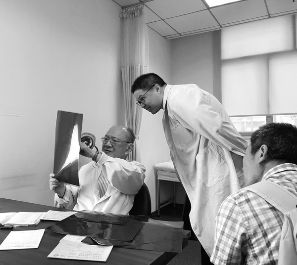 对待患者,老师从未有过架子,他对所有患者一视同仁、一丝不苟。随师坐诊的日子里,我总能深刻感受到老师对诊疗工作的专一:问诊细致入微,一个症状的发生时间、诱发因素、疼痛部位、歇止规律,他都会逐一询问;体格检查事必躬亲,规范而细致;阅片时专注认真,力求全面掌握患者病情。面对患者的疑问,他不厌其烦,总能用通俗易懂的语言和形象生动的举例,为患者讲解病情,帮助患者理性地了解疾病,树立治疗的信心。
