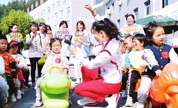 杭州市首届婴幼儿体能运动会于近日在淳安县威坪镇“医、防、护”儿童健康管理中心举办。杭州第19届亚运会直道竞速龙舟赛项目3枚金牌获得者范逸婷现身活动现场,为参赛“运动员”讲解如何划龙舟。