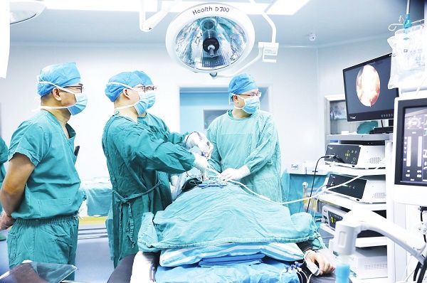 湖南省永州市新田县人民医院手术室,县人民医院医生在南华大学附一医院专家带教下,为一名腰椎管狭窄患者做手术。