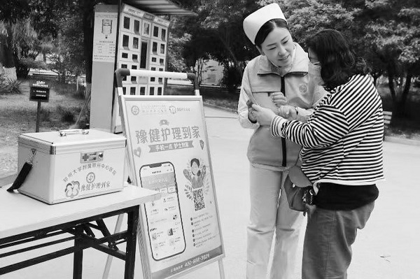 图为郑州市中心医院护士在社区宣传“豫健护理到家”服务。医院供图