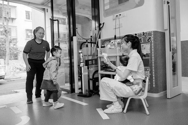 2025年4月24日,在福建省厦门市湖里区天地金尚托育中心,保育员在为孩子检查身体。