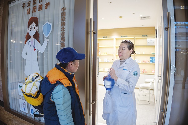 ②2月2日,北京站医务室的工作人员在为旅客答疑解惑。春运期间,北京站在显著位置设置医务室,备足常用非处方药和防疫用品,为旅客提供医疗卫生服务。