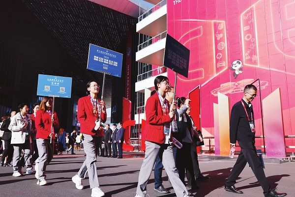 11月5日,第七届中国国际进口博览会开幕式在国家会展中心(上海)举行。图为志愿者带领参会嘉宾进入会场。