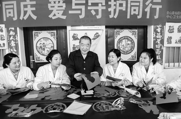 5月11日,安徽省含山县仙踪镇中心卫生院邀请市级非遗传承人洪诗成指导医务人员,以护士形象为主题创作剪纸。