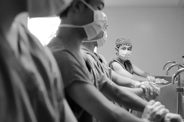 近日,重庆市沙坪坝区中医院手术室护理带教组长(右一)为男护理实习生培训外科手消毒。