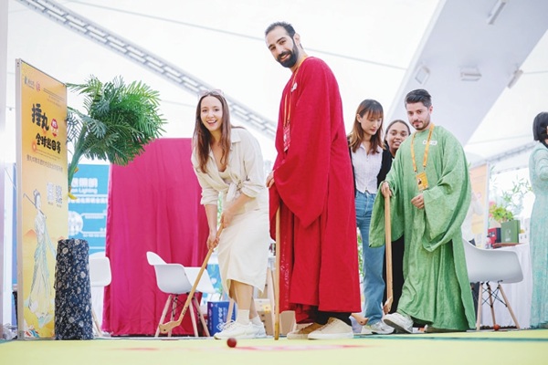 9月13日,体育服务专题展区,外国友人在体验中国传统体育运动捶丸。