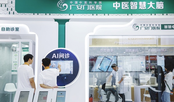 9月11日,中国中医科学院广安门医院的“中医智慧大脑”展区,参观者体验AI问诊等中医药智能服务。
