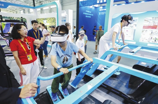 9月13日,体育服务专题展区,参观者体验模拟滑雪。