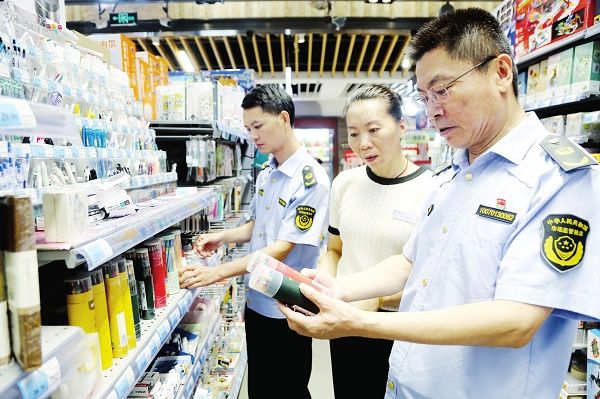 新学期临近,江苏省连云港市连云区市场监督管理局对学校周边开展护航“开学经济”专项整治行动,重点对书包、文具、零食等商品开展质量安全检查,严厉打击销售假冒伪劣产品行为。图为8月28日,执法人员正在辖区检查。视觉中国 供图