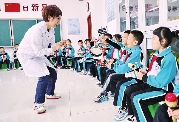 10月9日,河北省秦皇岛市第一医院音乐心理治疗师来到当地学校开展“体验趣味音乐心理游戏保持乐观心态”活动。图为音乐心理治疗师带领学生体验心理游戏“多种乐器来合奏”。