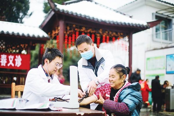 1月28日,在贵州省毕节市黔西市永燊彝族苗族乡茨落社区,永燊卫生院医务人员为居民检查身体。连日来,该卫生院开展“2024年健康进万家新春义诊”活动,提供送医上门、心理咨询等服务。 周训超 摄