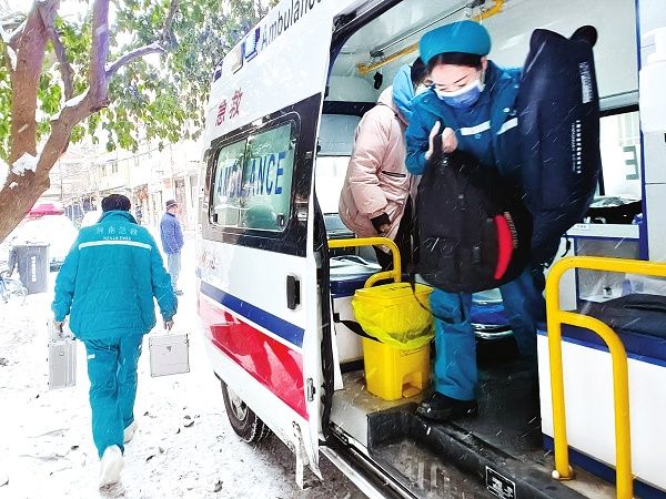 2月1日,河南各地普降大雪。当日9时53分,河南省开封市中心医院急诊科大厅响起紧急铃声,3位医务人员立刻拿起急救箱,迅速出发;10时2分,救护车抵达患者住处。在采取急救措施后,医务人员争分夺秒将患者转运回医院。图为医务人员抵达急救现场。 本报记者 李季 通讯员 何慧 摄影报道