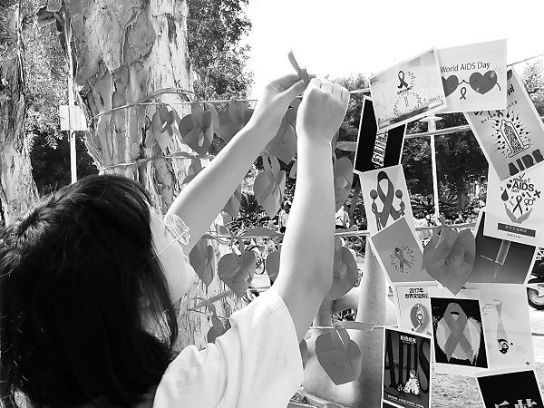 青年学生在世界艾滋病日参与宣传活动并悬挂红丝带
