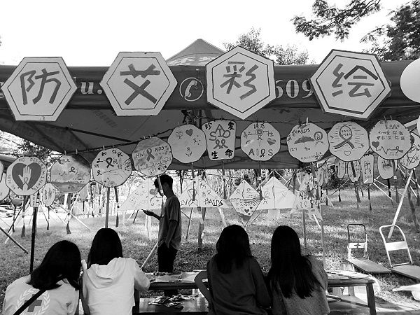 学生社团在校园内开展“防艾彩绘”扇面制作活动