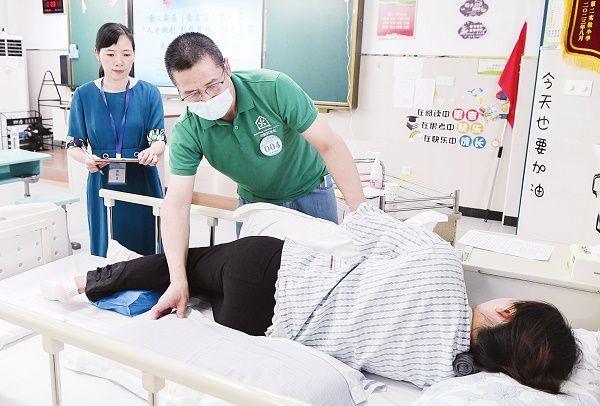 7月6日,浙江省金华市金东区举办第八届养老护理员技能竞赛,旨在进一步提升养老护理员的技能水平和专业素质,为老年人做好服务工作。图为选手进行实操比赛。视觉中国 供图
