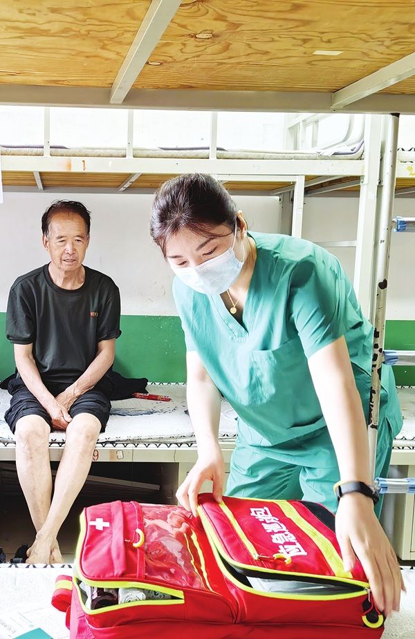 7月26日下午至27日凌晨,北京市密云区西北部地区出现强降雨,达到特大暴雨级别。暴雨引发山洪、山体滑坡,多个村庄受灾,抢险救援工作持续进行。图为在密云区不老屯镇临时安置点,社区医务人员给临时安置人员提供健康服务。通讯员 屠媛媛 本报记者 郭蕾 摄影报道