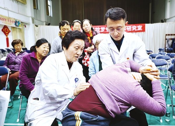 11月13日,国家级非物质文化遗产项目罗氏正骨法代表性传承人、航空总医院中医科罗素兰教授带领团队,走进北京科技大学开展“非遗进校园·志愿服务行”义诊活动。医务人员为离退休职工提供正骨服务,并宣传科学养生知识。图为罗素兰运用罗氏正骨法为一名职工进行诊治。本报记者 张丹 通讯员 张建房 摄影报道
