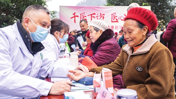 12月29日,重庆市彭水苗族土家族自治县“千医下访 医心为民”健康赶场活动走进该县高谷镇。来自山东省聊城市的支医专家和彭水县人民医院、中医院、妇幼保健院、疾控中心、结防所、健康教育所的30多名专家,为当地村民开展健康服务,宣传健康知识,免费发放健康礼包。图为专家为村民把脉问诊。通讯员王婷婷 特约记者欧阳方怡 摄影报道