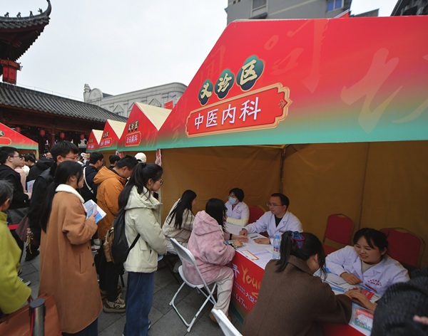 1月18日,江西省南昌市,上海中医药大学附属龙华医院江西医院(江西中医药大学附属医院高新院区)组织医务人员,走进万寿宫历史文化街区开展大型专家惠民义诊活动,为市民提供养生保健、中医诊疗等服务。图为中医义诊现场。视觉中国供图