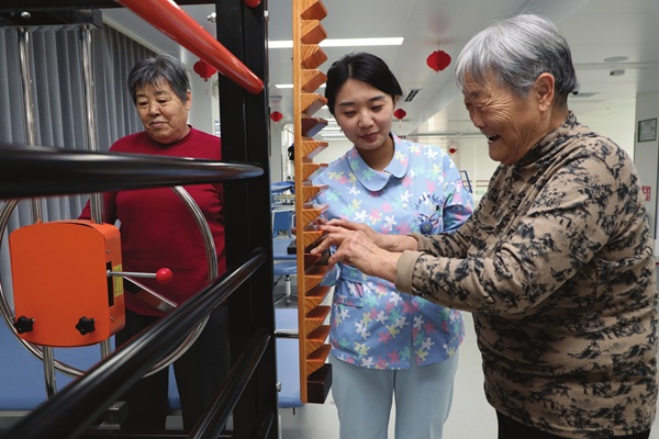 3月25日,在山东省滨州市博兴县中医医院杏林养护院康复大厅,入住老人在照护人员指导下进行康复锻炼。 近年来,博兴县按照老年群体就医养老核心需求,持续完善全链条医养结合服务体系,推动惠民政策精准落地。该县创新融合模式,紧扣“医院﹢养老”融合主线,推动基层医疗卫生机构与养老机构深度合作,为失能半失能等重点人群提供“医疗﹢照护”无缝衔接服务,实现全流程常态化监管,全力保障医养服务规范、安全、高质量运行。中新社供图