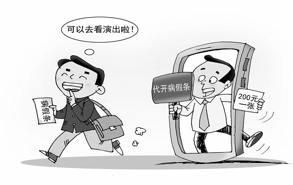近日,有媒体报道,代开病假条的小广告在网络平台泛滥。卖方在代开病假条的过程中牟取暴利。买方的目的各异:有人为了请假办事,有人为了满足机票、演出票等的退改签条款,还有人图谋将伪造的病假材料用于骗取医保资金……
