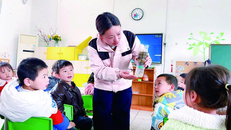 近日,江西省遂川县珠田育苗幼儿园的老师带领孩子们自制简易净水装置,让孩子们在动手操作中学习水资源保护知识,从小树立节水、爱水、护水的环保意识。图为孩子们在观察净水装置,直观感受污水变清的过程。李建平摄