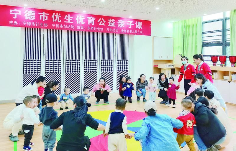 近日,在宁德市优生优育公益亲子课现场,孩子们在老师和家长的带领下快乐地做游戏。 郑巧星摄