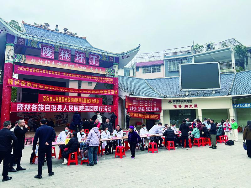 冬日,桂西北的清晨,透着阵阵寒意。广西壮族自治区隆林各族自治县“隆林圩T”休闲广场一早便热闹起来——百色市人民医院的专家巡回医疗队来了。