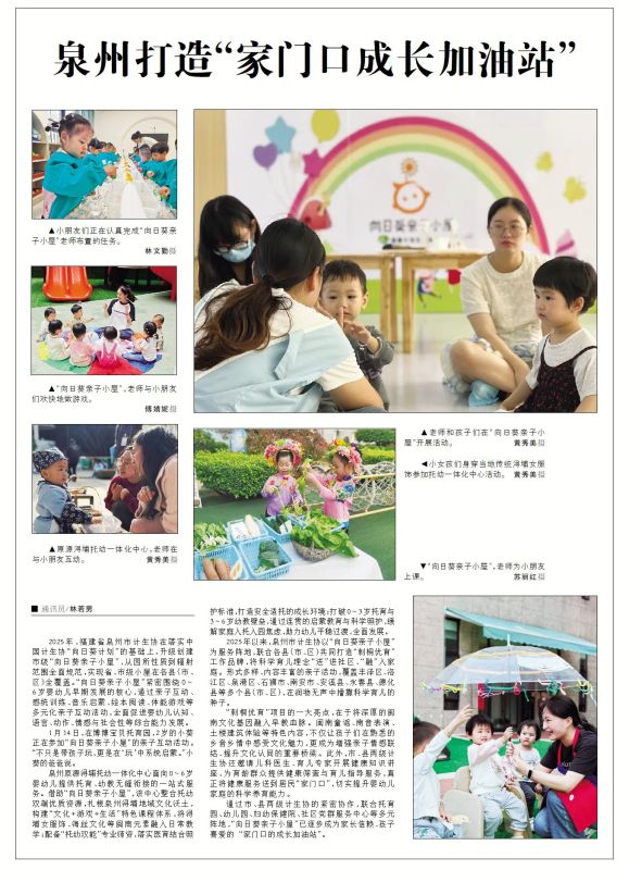2025年,福建省泉州市计生协在落实中国计生协“向日葵计划”的基础上,升级创建市级“向日葵亲子小屋”,从园所性质到辐射范围全面规范,实现省、市级小屋在各县(市、区)全覆盖。“向日葵亲子小屋”紧密围绕0~6岁婴幼儿早期发展的核心,通过亲子互动、感统训练、音乐启蒙、绘本阅读、体能游戏等多元化亲子互动活动,全面促进婴幼儿认知、语言、动作、情感与社会性等综合能力发展。